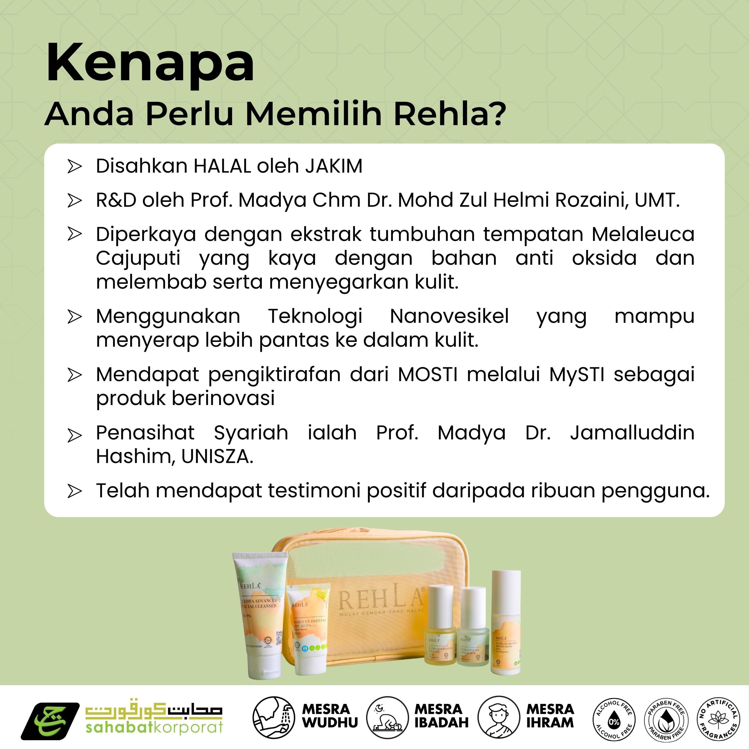 {"ops":[{"insert":"\nDari kuasa Bromelain, kami telah mencipta siri yang memenuhi keperluan penjagaan wajah dan badan. Dengan status Halal dan Sah dalam Ihram, gunakanlah Rehla tanpa was-was.\n\n\n\n"},{"attributes":{"color":"#777777"},"insert":"From the power of Bromelain, we have formulated a series of skincare products that suit your body, or facial needs. Use without worry; Rehla’s products have been certified Halal and are permissible to be used when in Ihram. "},{"insert":"\n"}]}